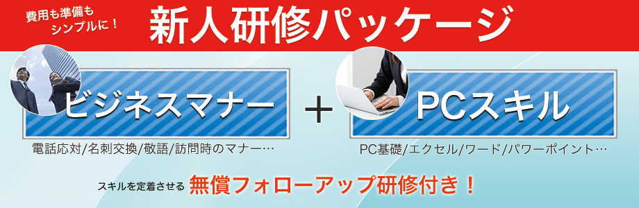 ビジネスマナーとパソコンスキルの研修、新入社員研修で定番のカリキュラムがセットになりました。予算管理も打ち合わせもひとつにまとめられます。
